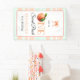 One sweet peach First Birthday watercolor stripes vertical banner. This delightful First Birthday sticker features the text "ONE sweet peach" which cleverly incorporates a peach graphic in place of the letter "O" and a coquette bow in peach. The text is placed in a white frame bordered with watercolor stripes in peach and mint green.