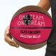 Red personalised basketball. The design has red panels, one of which can be customised with your choice of name and team. The top panel has the quote "one team one dream" lettered in decorative typography with a black basketball. A great gift for a basketball player.