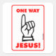 This Christian street sign has an image of a hand that is pointing towards heaven with the words "One Way" and "Jesus" written in bold red lettering.