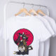 This design is a fierce and mysterious female samurai warrior. She is wearing traditional samurai armour, including a black and gold breastplate and a white cloth wrapped around her waist. Her hair is up in a pony tail. She is also wearing a face mask to hide her identity. There is a large red full moon behind her. She is also holding two katanas.