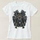 This image depicts a stylised samurai mask, inspired by the oni, a Japanese demon or ogre. The mask is primarily metallic, with intricate details and a menacing expression. The eyes are narrowed, and the mouth is open in a ferocious snarl. A cherry blossom is prominently displayed on the forehead, adding a touch of contrast and symbolism. The mask is framed within a circular design, further emphasizing its powerful presence.