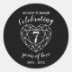 Onyx celebrating 7 years of love anniversary stickers. Simple outline crystal stone effect graphics in black and white, 7th Wedding Anniversary round stickers. Customise with your own seventh wedding anniversary party details. The 7th Anniversary is associated with black onyx gemstone and the heart symbolises love. Graphics and design by Sarah Trett for www.mylittleeden.com on zazzle.
