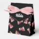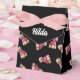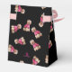 Stylish and fun black party favor boxes scattered with poodles dressed in pink, and finished with a pink bow. What's not to love?