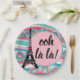 These paper plates have a French flair - a silhouetted Eiffel Tower and "ooh la la!" within a pink disc. The background is a modern, wavy design in pink and aqua. Want to change the text? Just tap "Edit Design": "Edit text". Check out my matching napkins, coasters, etc. by tapping my shop name.