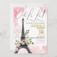 Lovely birthday invitation with a Paris theme that includes a pink watercolor background with a fleur de lis and the Eiffel Tower dressed in a pink bow with Cherry Blossoms and a green leaf branch. Black, pink, and gold font place holder text is easily updated with your particulars. "Ooh La La!" in bold text across the top adds to the excitement.