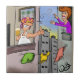 A tile with a funny cartoon about laundry flying in a man's face. Original artwork by DBcartoons.
