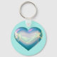This keychain features an opal blue heart with a satin appearance on a light blue background.