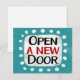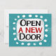 "Open A New Door" is a cute inspirational or motivational quote with a white accent shape surrounded by white textured whimsical dots.