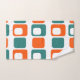 This towel set has a mid-century modern design of repeating orange rectangles with white rectangles inside alternating with teal rectangles.
