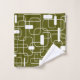 This towel set has a mid-century modern design of open and closed rectangles in white on a field of camo green.