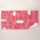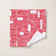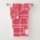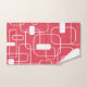This towel set has a mid-century modern design of open and closed rectangles in white on a field of retro red.