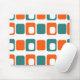 This mouse pad has a mid-century modern design of repeating orange rectangles with white rectangles inside alternating with teal rectangles.