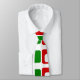 This necktie has a Christmas mid-century modern design of repeating orange rectangles with white rectangles inside alternating with teal rectangles.