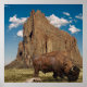 A lone buffalo grazes in front of a strikingly rugged mountain range under a clear blue sky. The sunlight casts a warm glow over the landscape, highlighting the contrasting textures of the rocky mountain and the fur of the buffalo. This image was created by combining four images in photoshop.