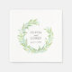 A contemporary wedding paper napkin featuring an open watercolor laurel wreath in delicate green and blue hues. Enter your details in place of the sample text shown.