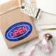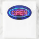 Oval sticker with an image of a blue and red neon “open” sign on black. The back is black with customisable text. See the entire Tubular 80s Sticker collection in the INVITES | Stickers & Labels section.