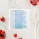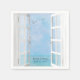 Open white window with white sheer curtains and watercolor ocean water and seagulls for wedding reception or anniversary party.