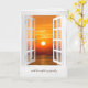 open white window with sheer curtains and sunrise scene over water for sympathy