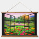 Beautiful watercolor brush rendition of a stunning garden view out the open window at home getaway
