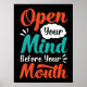 Transform your space with an inspiring message! This "Open Your Mind Before Your Mouth" poster is a reminder to embrace wisdom and thoughtfulness. Its dynamic and modern design fits perfectly in an office, classroom, or living space. Encourage meaningful conversations and proudly display your mindset with this motivational wall art. *Ideal for a workspace or relaxation area. *Eye-catching and inspiring design. *A daily reminder to think before speaking.
