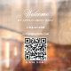 A white opening business hours window decal and window cling featuring business logo, QR Code, your custom and contact details. A personalised elegant welcome sign shop hours by appointment only window cling perfect for shop windows and front door signs. Perfect for a business shop owner who would like to notify their customers about its opening hours.