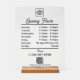 A black script opening business hours acrylic sign featuring business logo, QR Code, your custom social media icons and contact details. A personalised shop hours clear acrylic sign perfect for shop tabletops. Perfect for a business shop owner who would like to notify their customers about its opening hours.