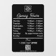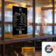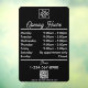 A black and white script opening business hours window decal and window cling featuring business logo, QR Code, your custom social media icons and contact details. A personalised shop hours window cling perfect for shop windows and front door signs. Perfect for a business shop owner who would like to notify their customers about its opening hours.