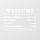 Opening hours window cling featuring white or custom colour text "Welcome" and your opening hours on a transparent background. Colours and fonts can be changed with the design tool.