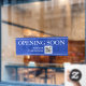 OPENING SOON Sign with QR code for store entry door or window in white text on deep blue background with QR code message.
