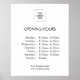 Keep your customers informed with this modern poster displaying your business opening hours. Featuring a clean and professional design, it’s perfect for storefronts, offices, or reception areas. Customise with your business logo and branding to create a polished and approachable display. Ideal for promoting transparency and professionalism, this poster ensures that your opening times are clear and easy to read while enhancing your company’s modern aesthetic.