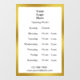 This business sign has a template you can edit to show your hours of operation. A display image, which you can replace with your business logo, is at the top. All text can be edited or deleted. The sign has an elegant faux (not foil) gold border.