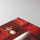 The scene depicts a luxurious and ornate bathroom with a striking red bathtub as the focal point. The bathtub is adorned with intricate floral designs in shades of pink and green, giving it a vintage, almost regal appearance. It stands on elaborately decorated golden clawfoot legs, adding to its opulence. Water is flowing from a classic, polished faucet into the tub, creating a serene ambiance. Behind the bathtub, there is a large, decorative fan with similar floral motifs, enhancing the room's cohesive aesthetic. The walls are also decorated with floral patterns, complementing the overall theme of elegance and beauty. The floor appears to be wooden, with a richly patterned rug adding warmth to the setting. Perched on the edge of the bathtub is a white cat named Ophelia, with striking blue eyes, looking alert and curious.