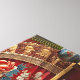 The scene depicts a luxurious and ornate bathroom with a striking red bathtub as the focal point. The bathtub is adorned with intricate floral designs in shades of pink and green, giving it a vintage, almost regal appearance. It stands on elaborately decorated golden clawfoot legs, adding to its opulence. Water is flowing from a classic, polished faucet into the tub, creating a serene ambiance. Behind the bathtub, there is a large, decorative fan with similar floral motifs, enhancing the room's cohesive aesthetic. The walls are also decorated with floral patterns, complementing the overall theme of elegance and beauty. The floor appears to be wooden, with a richly patterned rug adding warmth to the setting. Perched on the edge of the bathtub is a white cat named Ophelia, with striking blue eyes, looking alert and curious.