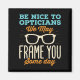 Funny optician gift for optical workers who fits eyeglasses. Design says, "Be nice to opticians we may frame you some day."
