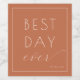 This elegant wedding wine label features a minimalist design with a warm rust-colored background and crisp white text, creating a sophisticated and inviting look. The layout is simple yet striking, with the phrase "BEST DAY ever" prominently displayed in bold uppercase letters paired with a flowing cursive script for added elegance. The modern style focuses on typography, ensuring clarity and impact without any additional motifs or distractions. Perfect for celebrating your special day, this label conveys a mood of optimism and joy, making it an ideal choice for commemorating your wedding.