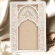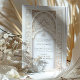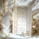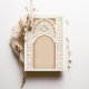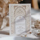 Behold the epitome of elegance with this opulent Islamic wedding invitation, which intricately weaves together the grandeur of gold and the purity of cream. The front presents a sophisticated frame of cream-coloured florals and gold geometric patterns, highlighted by a graceful Islamic calligraphy centerpiece. This exquisite design is reminiscent of the majestic art found in historic mosques and palatial estates. On the reverse, the floral cascade continues, framing a soft cream backdrop that is subtly adorned with an intricate pattern, inviting your esteemed guests with the promise of a celebration steeped in cultural richness and divine blessing. Ideal for a couple celebrating their union with a nod to their heritage, this invitation is a treasure in itself.