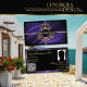 The design features a noble crown with shimmering, ornate golden decorative elements on a wavy, patterned, curved blue and plain black background.