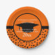 Orange and black Kindergarten graduation party cake paper plates. If you choose, you can upload your school insignia or another image to replace the graduation cap in the centre. Use the spaces provided to add your own text. If you want more creative freedom, use the Customise button to access Zazzle's tools. From here you can change the font, font size, colour and text placement.