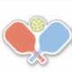 An illustration of pickleball paddles that are orange and blue and a yellow ball.