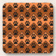 Cute cartoon style dog paw prints on a orange and brown chevron pattern.