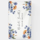 This striking watercolor floral bouquet showcases vibrant orange blooms paired with rich cobalt blue flowers, hand-painted in a soft, airy style. Tied with a flowing neutral ribbon, this design blends bold color with elegant watercolor texture.