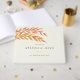 A lovely keepsake for the newly weds, this beautifully custom guestbook is easily personalised with names and dates, and features a gentle arch of leafy branches in warm autumnal hues of orange and red.