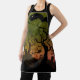 Orange and olive green haunted graveyard Halloween apron. This all-over print apron displays a haunted cemetery in orange and olive green with gravestones, spooky trees, a witch, an owl and bats.
