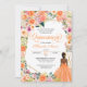 Quinceanera invitation with a beautiful floral spray of colourful flowers in orange, pink, blush, peach, yellow, lavender and purplewith gold accents and a girl with an elegant princess ball gown. Check the shop for this invitation with girls in different hair colours and skin tones.