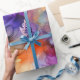 Vibrant swirls of purple, orange, and blue create a dynamic, ethereal composition resembling blooming flowers
