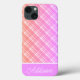 This iPhone case features an orange and purple gradient plaid pattern with a thick purple stripe and thin white stripe with a customisable name.
