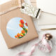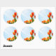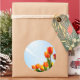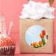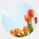 Round photo sticker with flowers consisting of orange and red tulips seen from a low point of view against a blue sky.