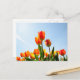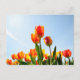 Postcard of flowers consisting of orange and red tulips seen from a low point of view against a blue sky.