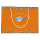 This modern design features a graduation hat and confetti in silver on a background of Orange with white text.