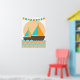 A nautical sailboat design nursery poster great for baby's room or an older child's room features a sailboat with teal blue and orange sails, a chevron stripe ocean of teal and orange, and teal and orange flag banner.